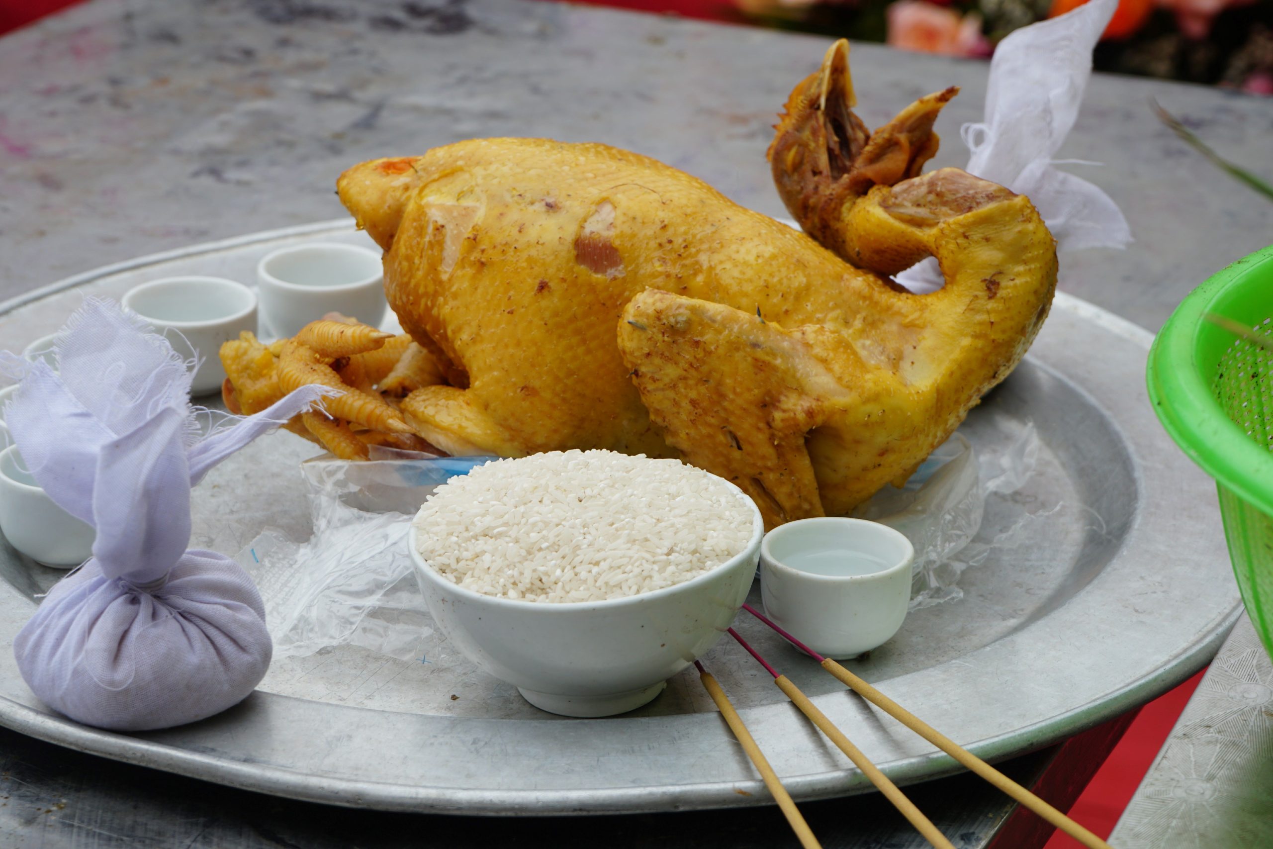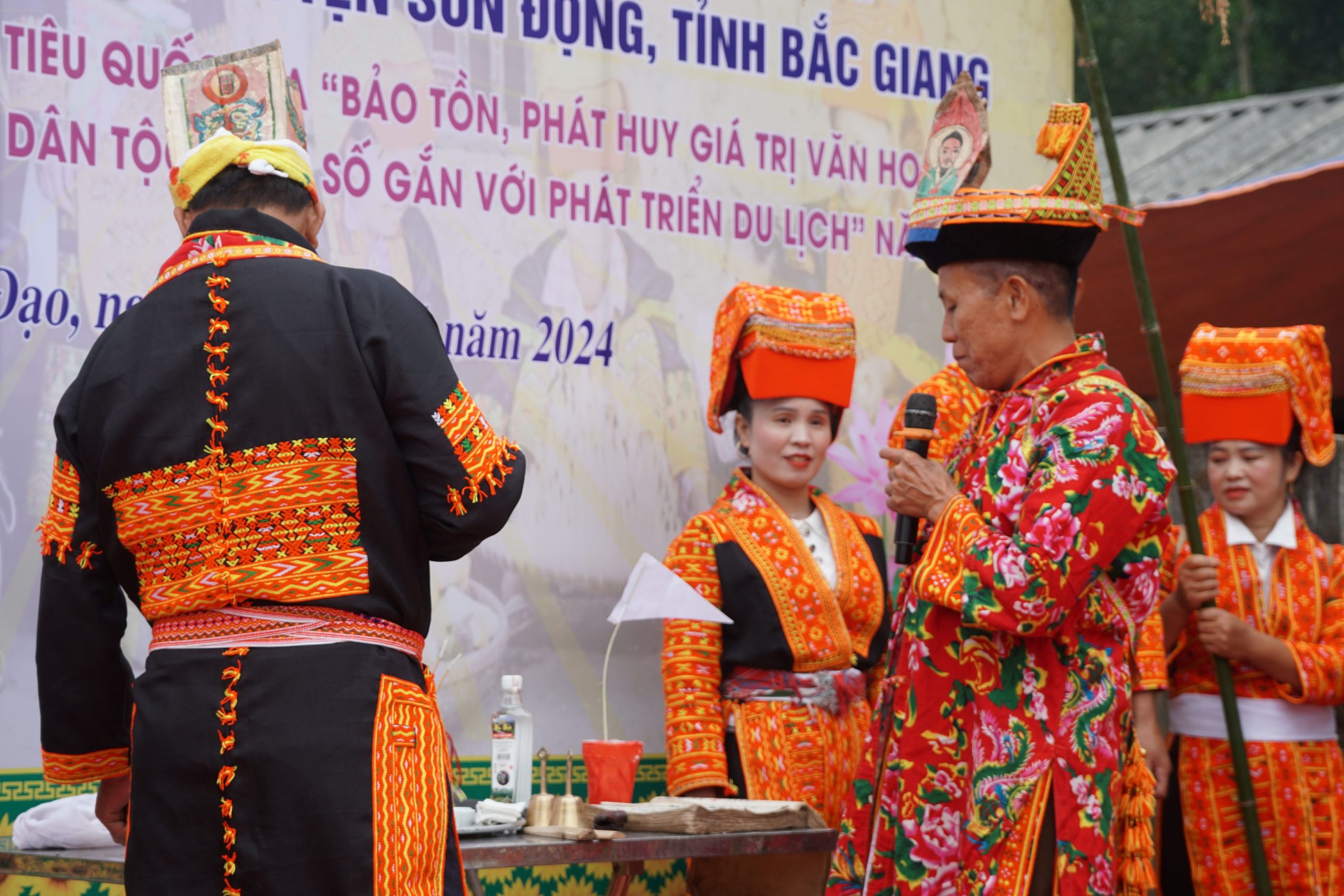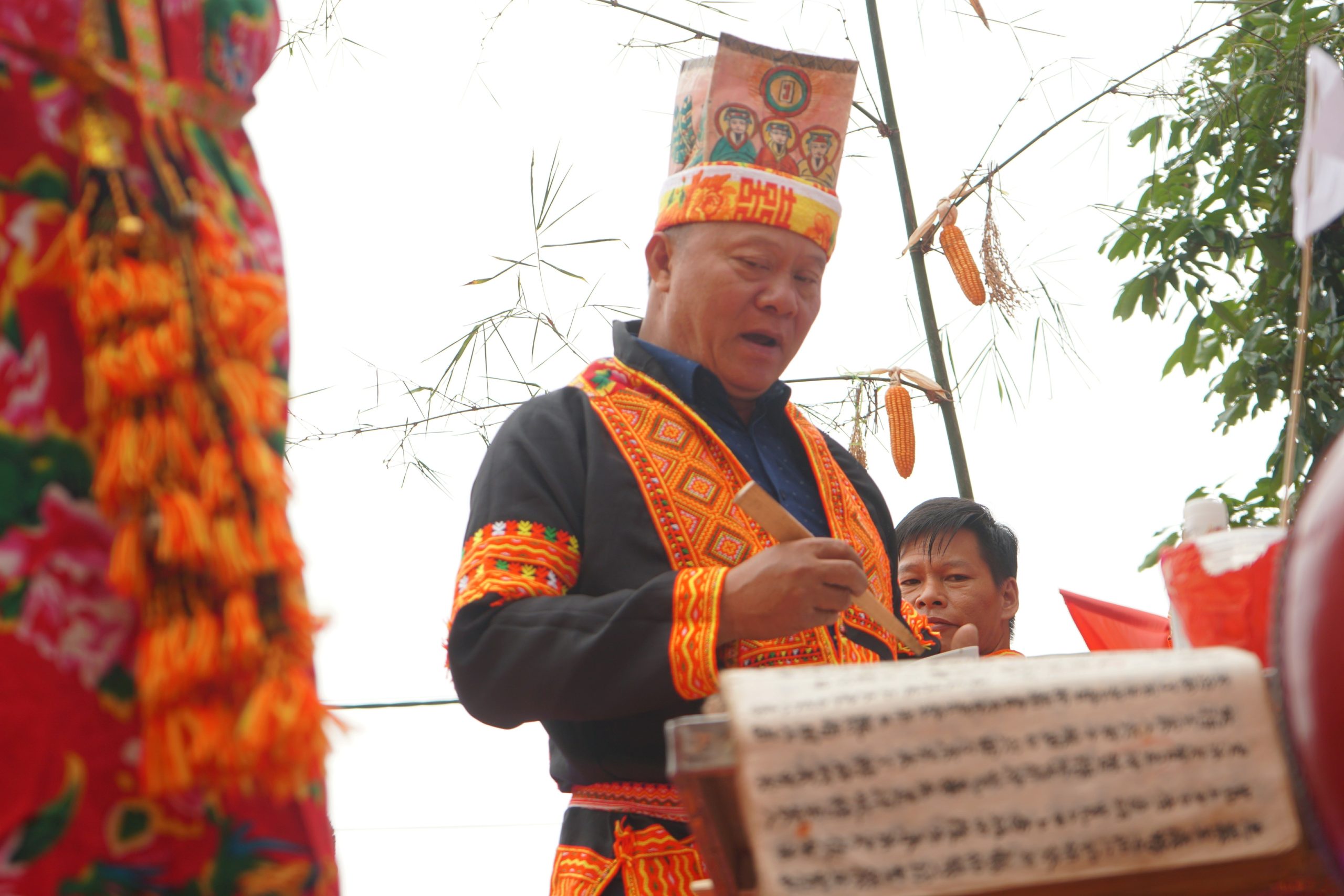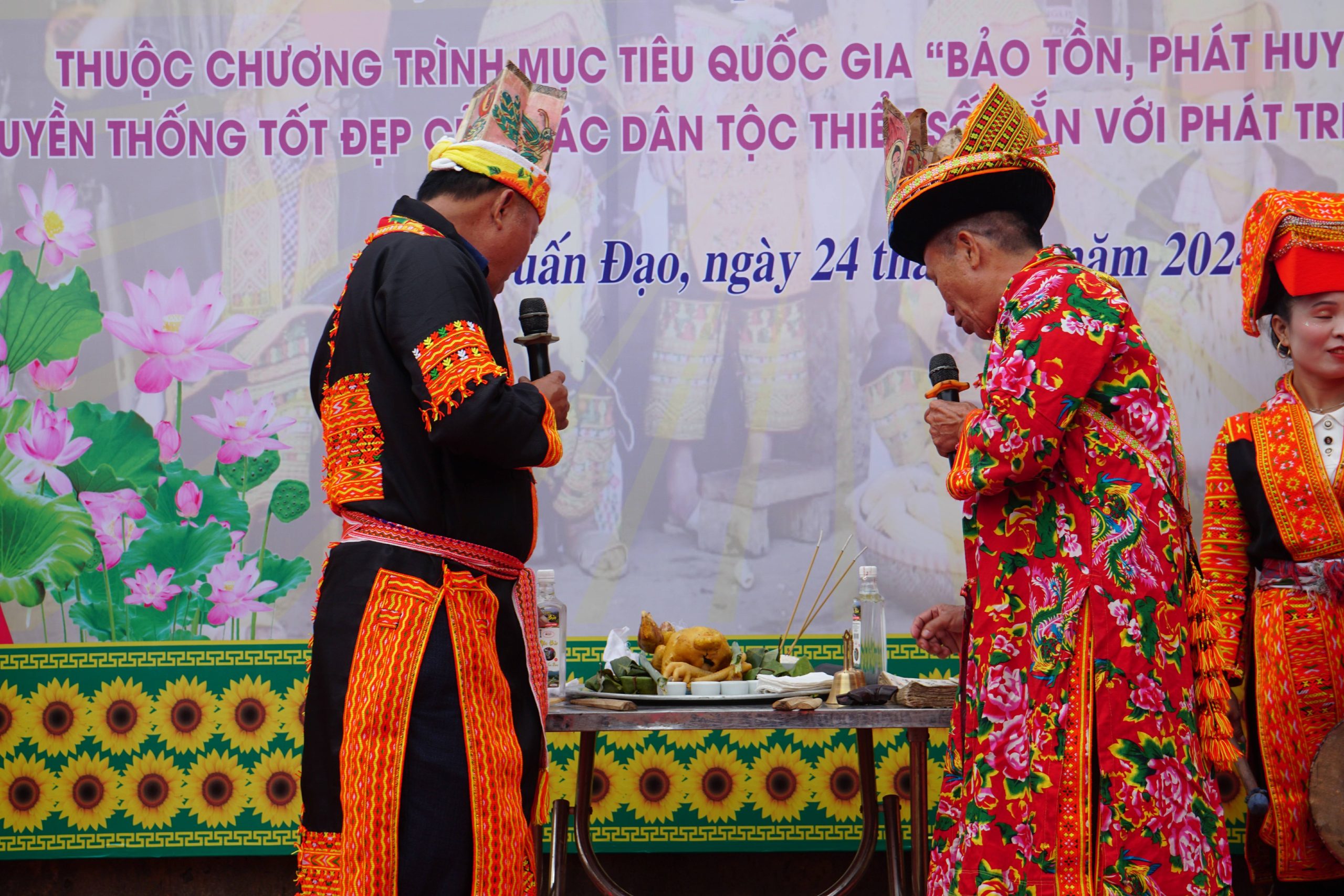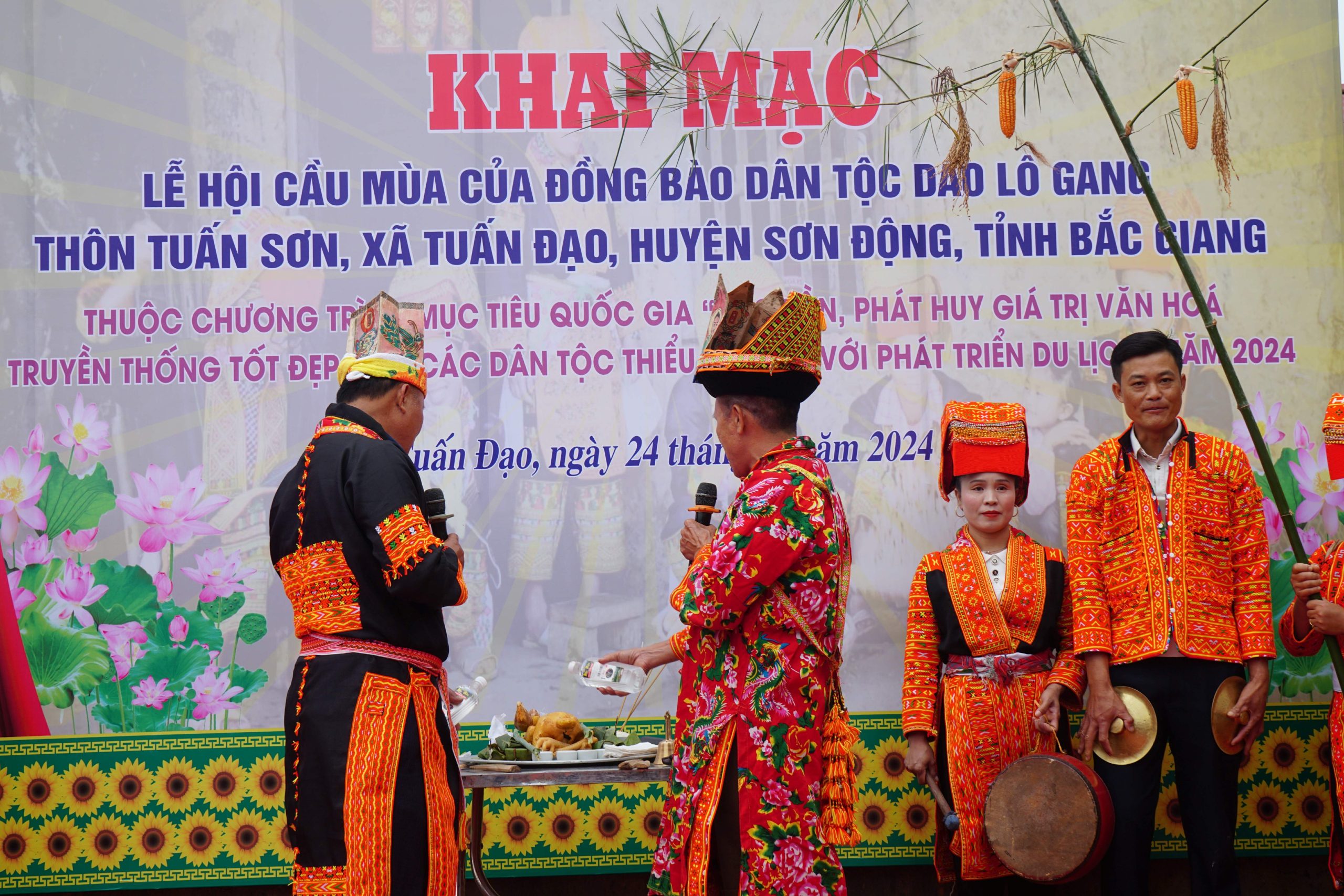 Trên mâm cúng có bát nước (lấy từ suối nước mạch nguồn trong thôn Tuấn Sơn), một đĩa xôi đỏ, một đĩa xôi vàng, một con gà luộc, một con dao nhọn. Hai bên mâm cúng là cụm bông lúa nếp, bắp ngô, hạt giống….. Phía sau mâm cúng là hai cây nêu làm bằng tre, trên thân cây tre buộc những bông lúa nếp và những bắp ngô mẩy hạt. Sau tất cả các thủ tục, 3 thầy cúng vào đàn làm lễ.