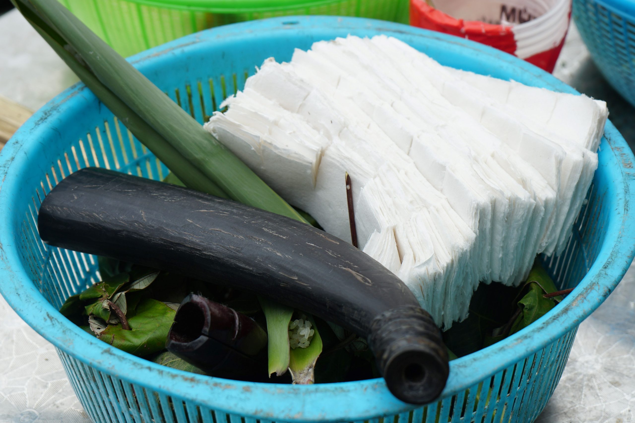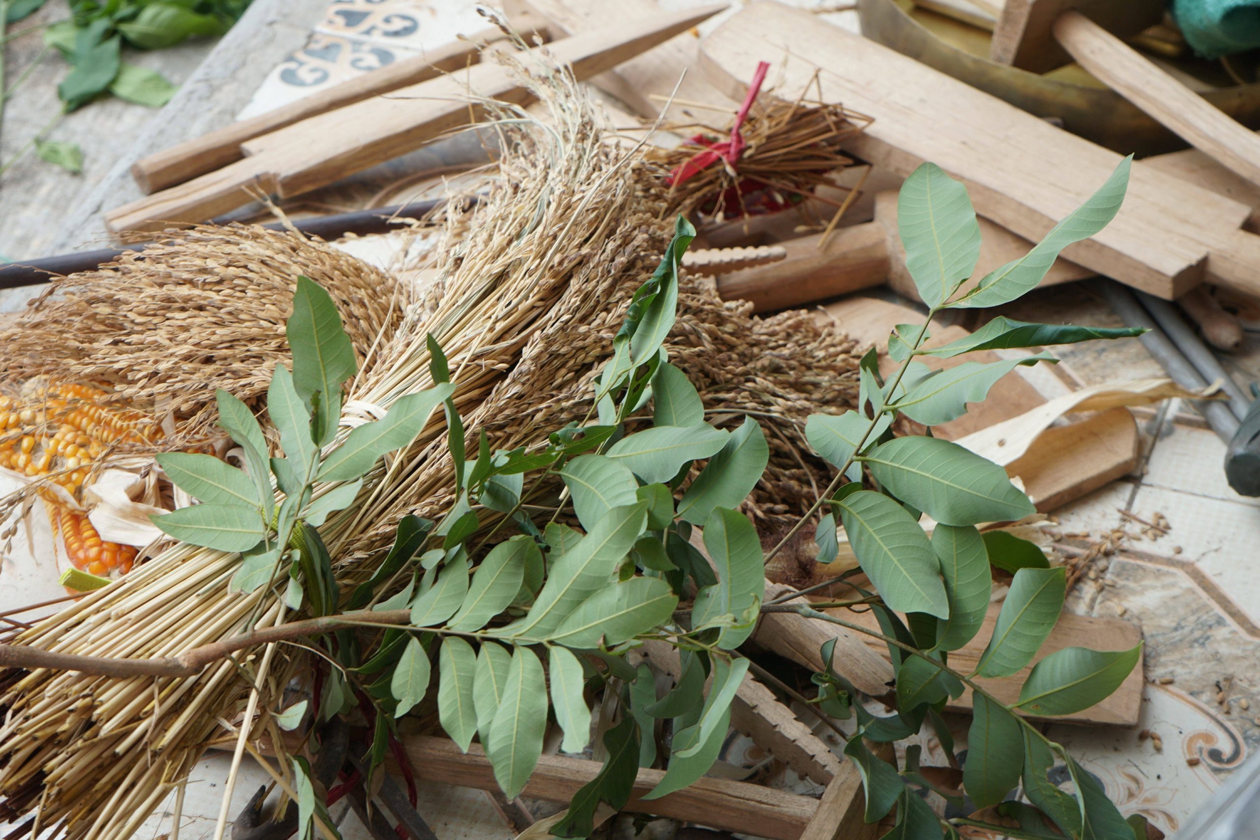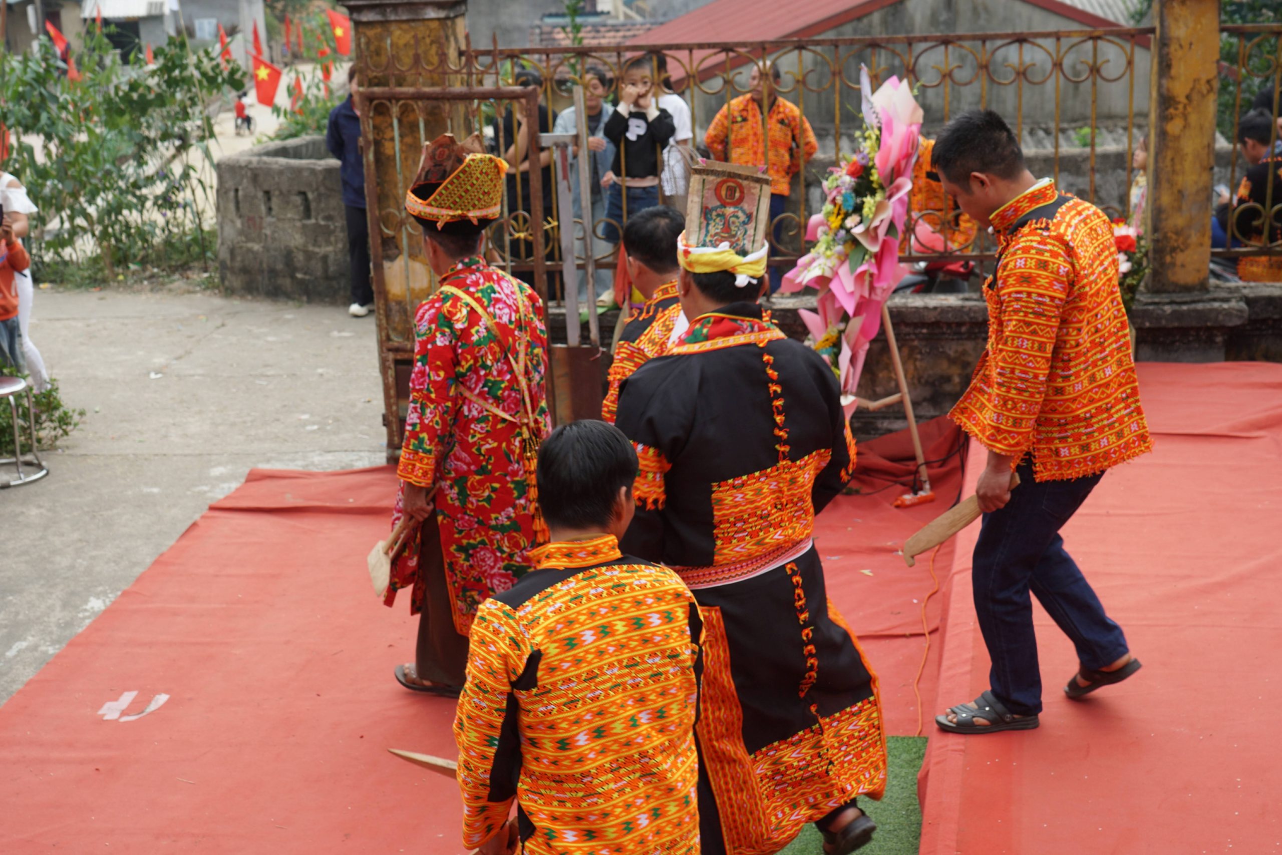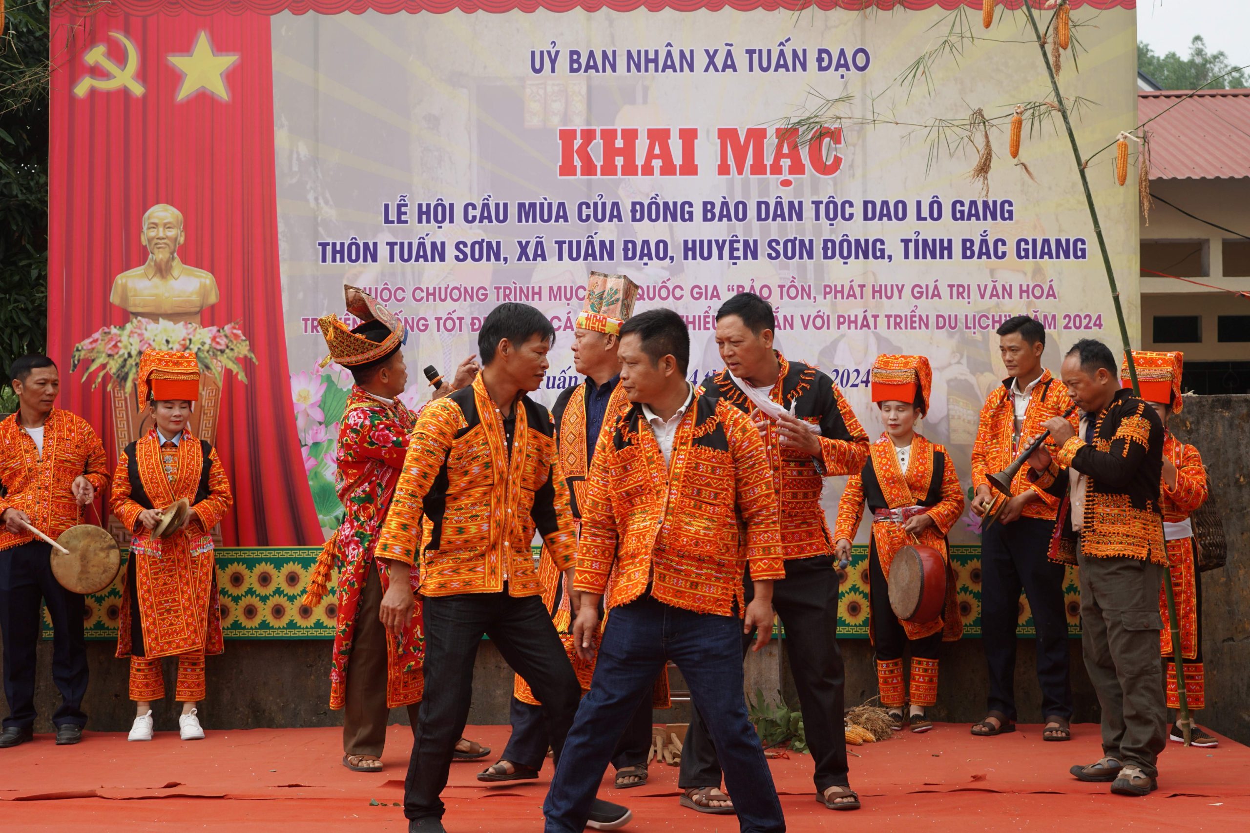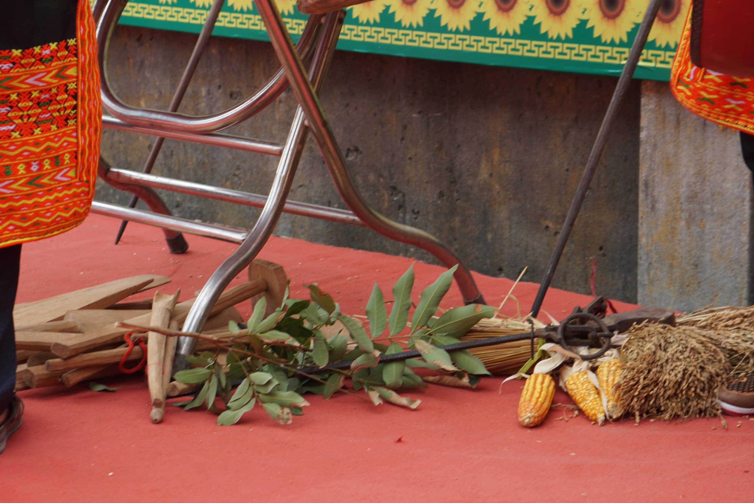 Bộ đạo cụ và cũng là công cụ lao động của bà con người Dao được chế tác mô phỏng bằng gỗ, tre bao gồm: quốc, xẻng, dao, lưỡi hái, cày bừa…Hai thầy cầm dụng cụ ….múa từ trong ra ngoài theo vòng tròn để xua đuổi quái vật, sâu bọ không cho xâm hại, quấy phá mùa màng, cây lương thực.