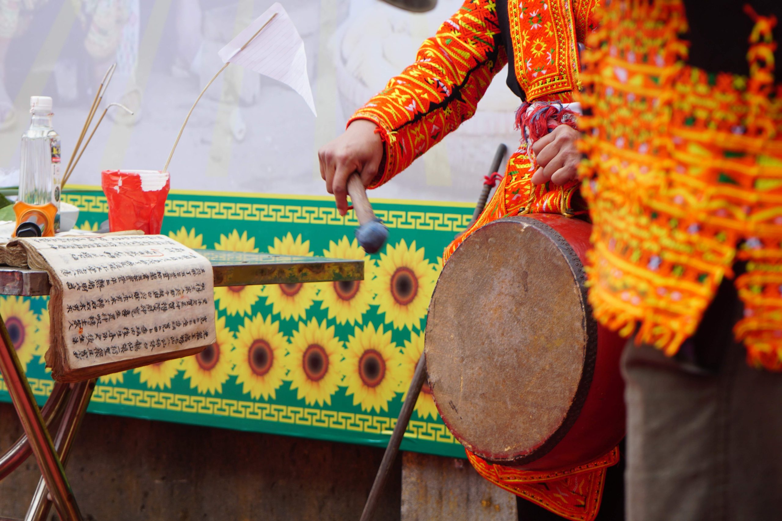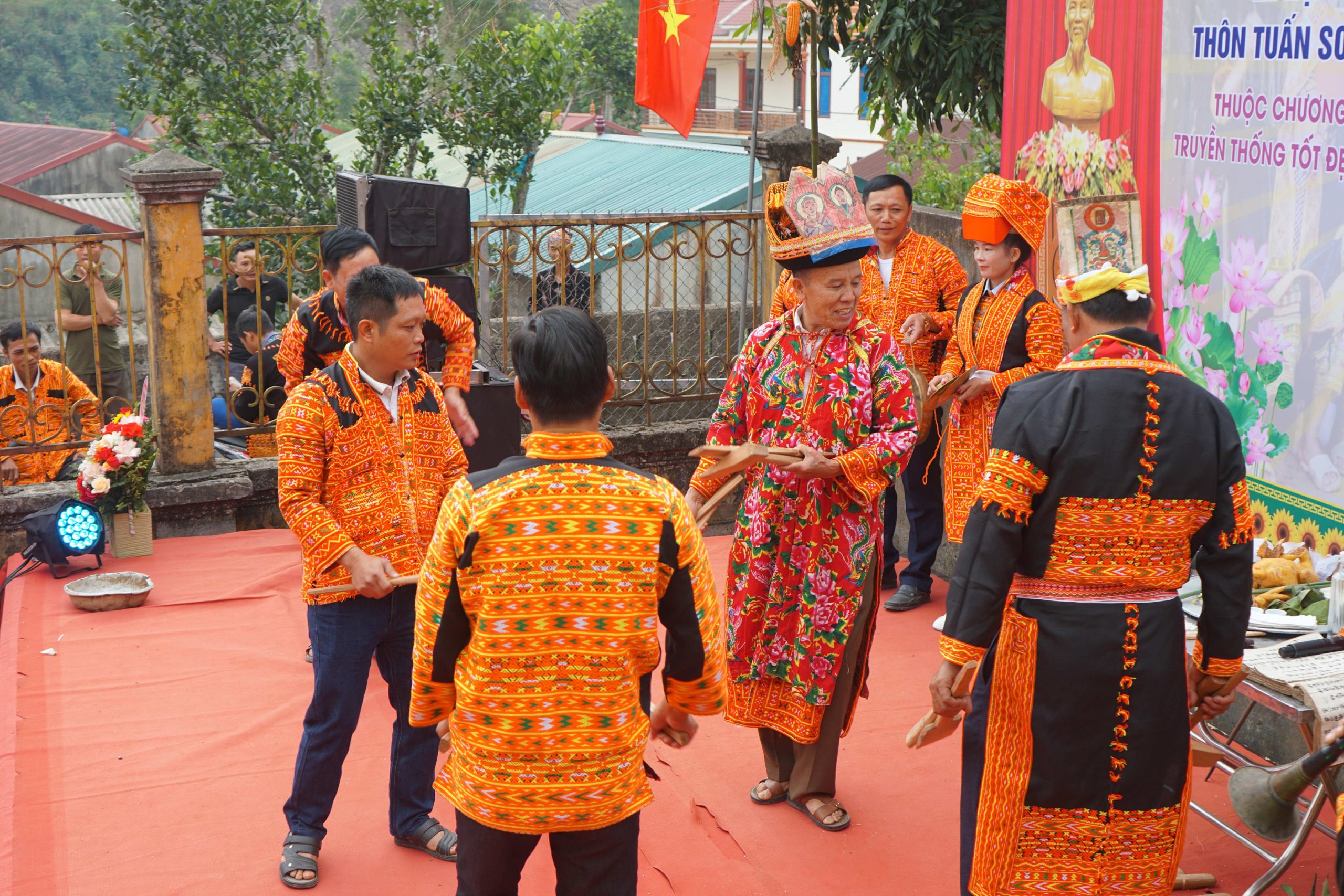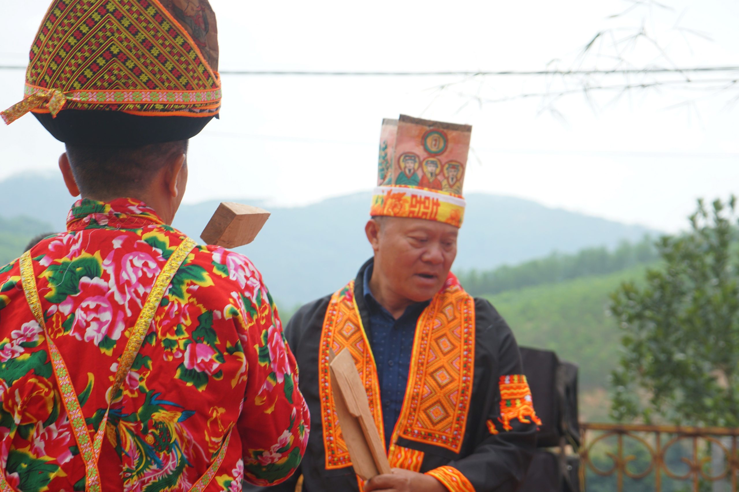 Trong thực hành tín ngưỡng, người Dao thường cúng theo sách cổ, văn tự được viết rất cụ thể, vì vậy quá trình cúng diễn ra trong một thời gian rất dài. Thầy cả cúng bên mâm cỗ để trước bàn thờ, các thầy cúng khác rung chuông, dùng đạo cụ cùng nhau nhảy múa theo vòng tròn ở giữa đàn lễ phụ họa thêm cho thầy cả. Việc cúng mời các vị thần được thực hiện rất trang trọng, với mong muốn được các vị Thần, Ngọc Hoàng về phù hộ để lễ hội đạt được kết quả tốt. Điệu múa dân gian với đạo cụ là quốc, sẻng, cây, gậy … mang nhiều ý nghĩa gắn với tín ngưỡng nông nghiệp của đồng bào.