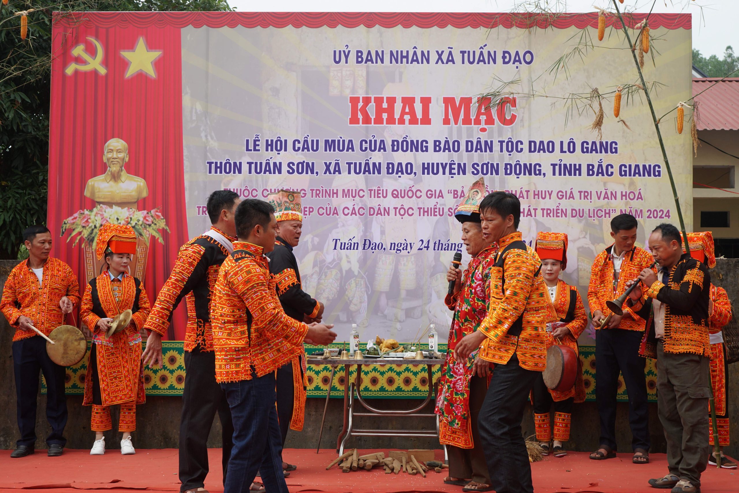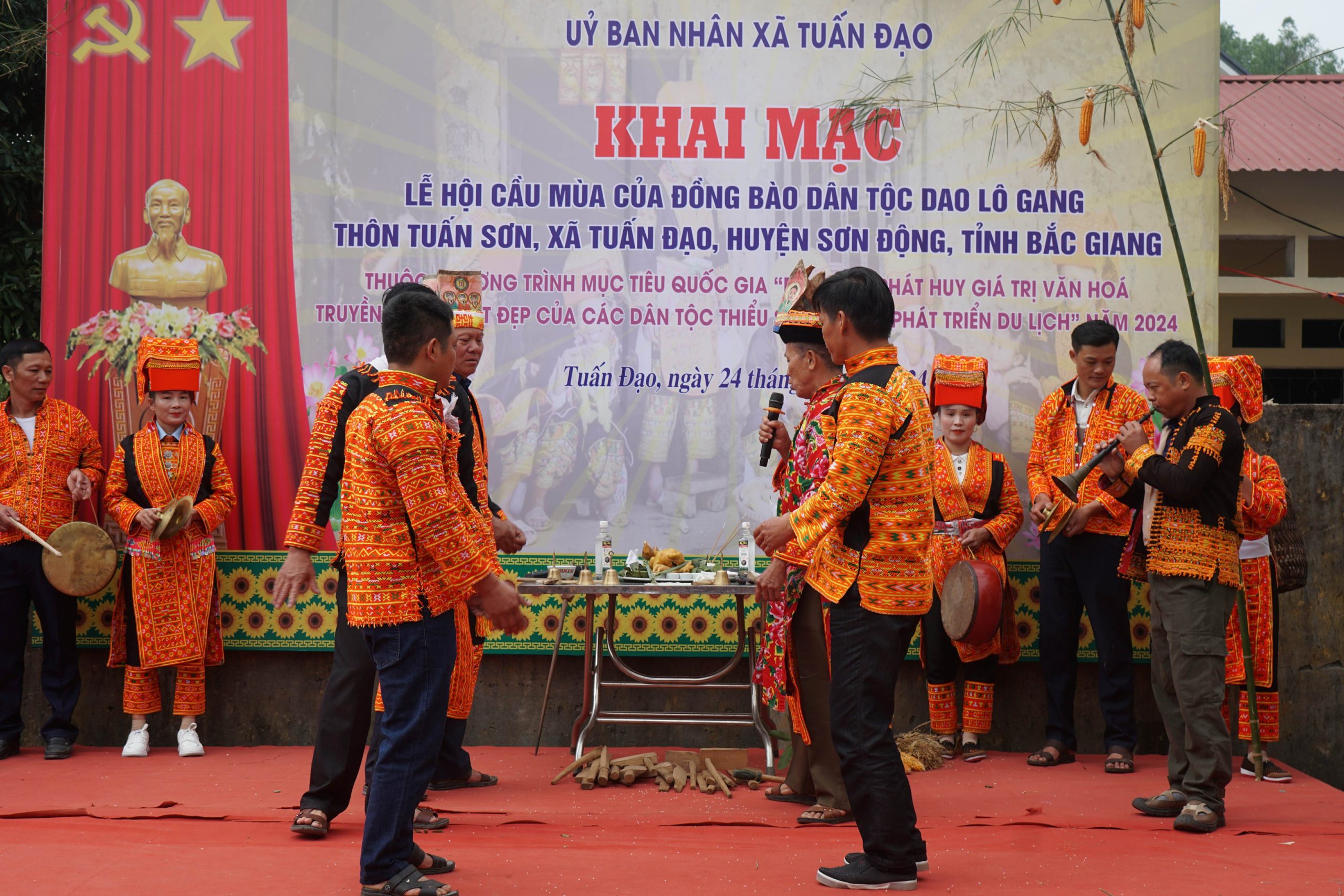 Một hồi chiêng, chống vang lên, lễ cúng mở hội cầu mùa bắt đầu. Các thầy thỉnh thánh báo cáo nội dung công việc làm lễ, chương trình làm việc mời các vị thần về thụ lễ. Lễ khai đàn, thỉnh 15 vị thần đại diện cho các vị thần từ trên trời, dưới đất và tổ tiên các dòng họ về dự lễ cầu mùa. Các vị thần được mời như: Thần Sông, Suối, Sơn Thần, thần Nông, Thổ Công, Thổ Địa, các cụ Tổ tiên đại diện của các dòng họ trong thôn và đặc biệt là Bàn Vương vị thuỷ tổ của người Dao được mời về chứng lễ.
